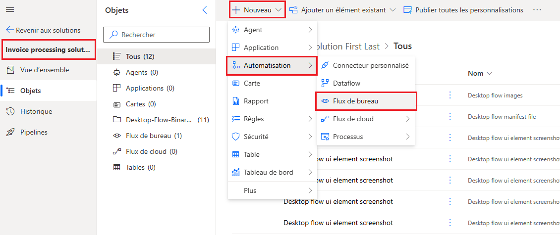 Depuis la Solution de traitement de factures créée lors d’un labo précédent, cliquez sur + Nouveau dans la barre d’outils en haut. Ensuite, sélectionnez Automatisation et Flux de bureau pour créer un flux de bureau.