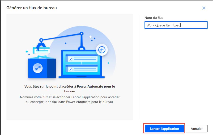 Nommez le flux Work Queue Item Load, puis cliquez sur Lancer l’application. Vous êtes alors redirigé vers un nouvel onglet de votre navigateur et devrez peut-être vous connecter à Power Automate pour le bureau si vous y êtes invité.