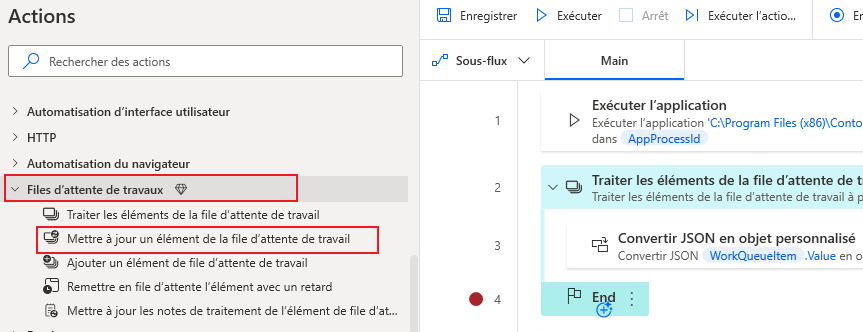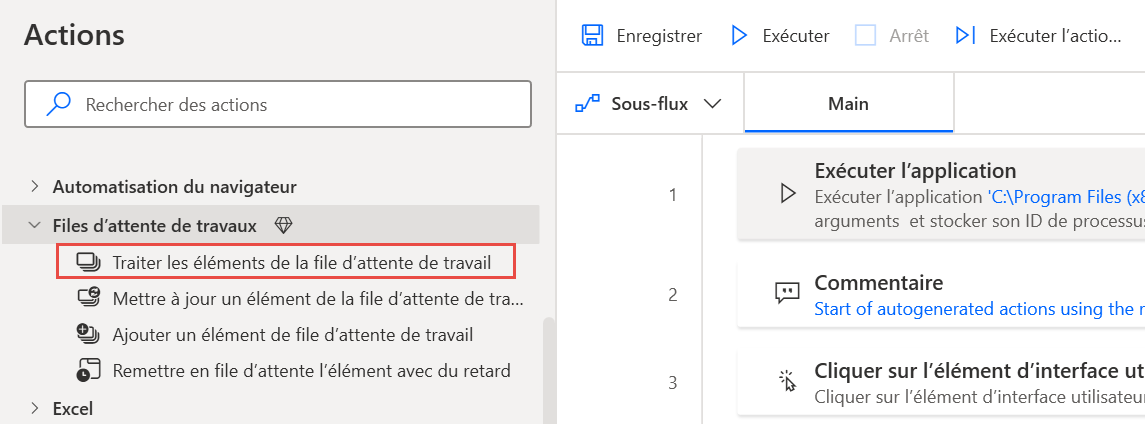 Accédez à la section Files d’attente de tâches dans le volet Actions et sélectionnez l’action Traiter les éléments de la file d’attente de tâches. Insérez cette action après l’étape Exécuter l’application déjà incluse dans le flux.