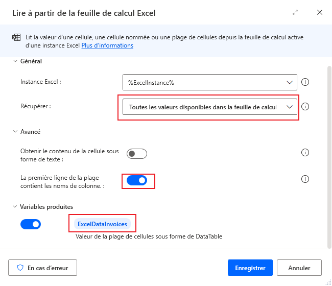 Cliquez sur le menu déroulant dans l’action Lire à partir de la feuille de calcul Excel pour le champ Récupérer et sélectionnez Toutes les valeurs disponibles dans la feuille de calcul. Ensuite, cliquez sur Avancé et réglez le bouton bascule La première ligne de la plage contient les noms de colonne sur Activé. Enfin, sélectionnez la variable produite et ajoutez Invoices au nom de la variable à afficher sous la forme ExcelDataInvoices.