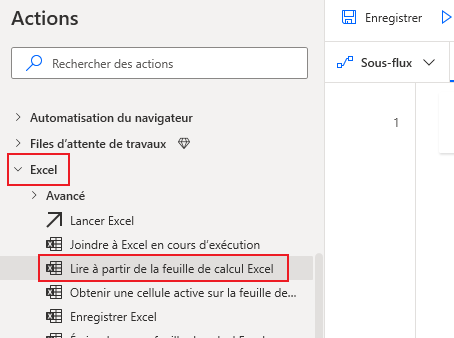 Dans la zone Actions Excel, sélectionnez l’action Lire à partir de la feuille de calcul Excel et ajoutez-la à l’étape suivante.