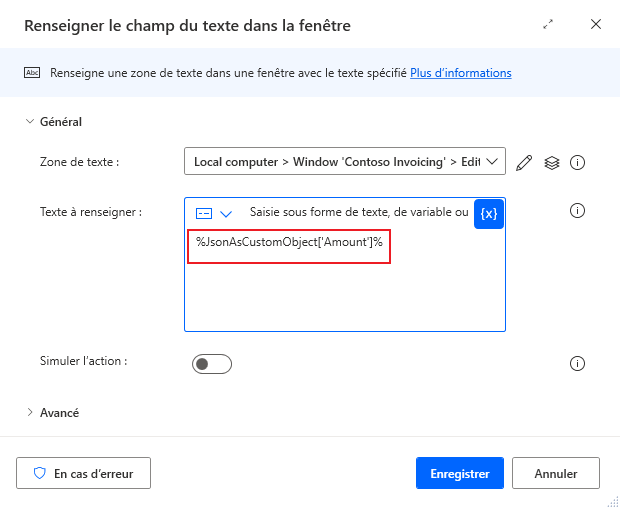 Modifiez les trois étapes Renseigner le champ de texte dans la fenêtre et supprimez la variable d’entrée précédemment utilisée pour remplacer le Texte à renseigner par une valeur du code JSON analysé stocké dans la variable JsonAsCustomObject.