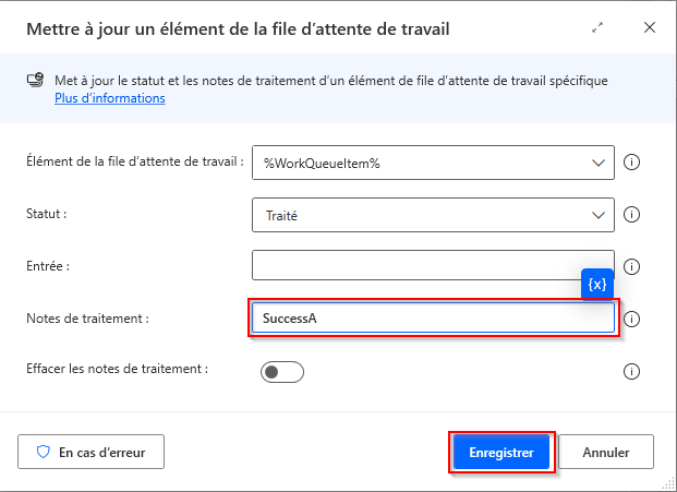 Laissez le champ Entrée vide et ajoutez le résultat du traitement Succès dans la boîte de dialogue Mettre à jour l’élément de la file d’attente de tâches, puis cliquez sur Enregistrer.