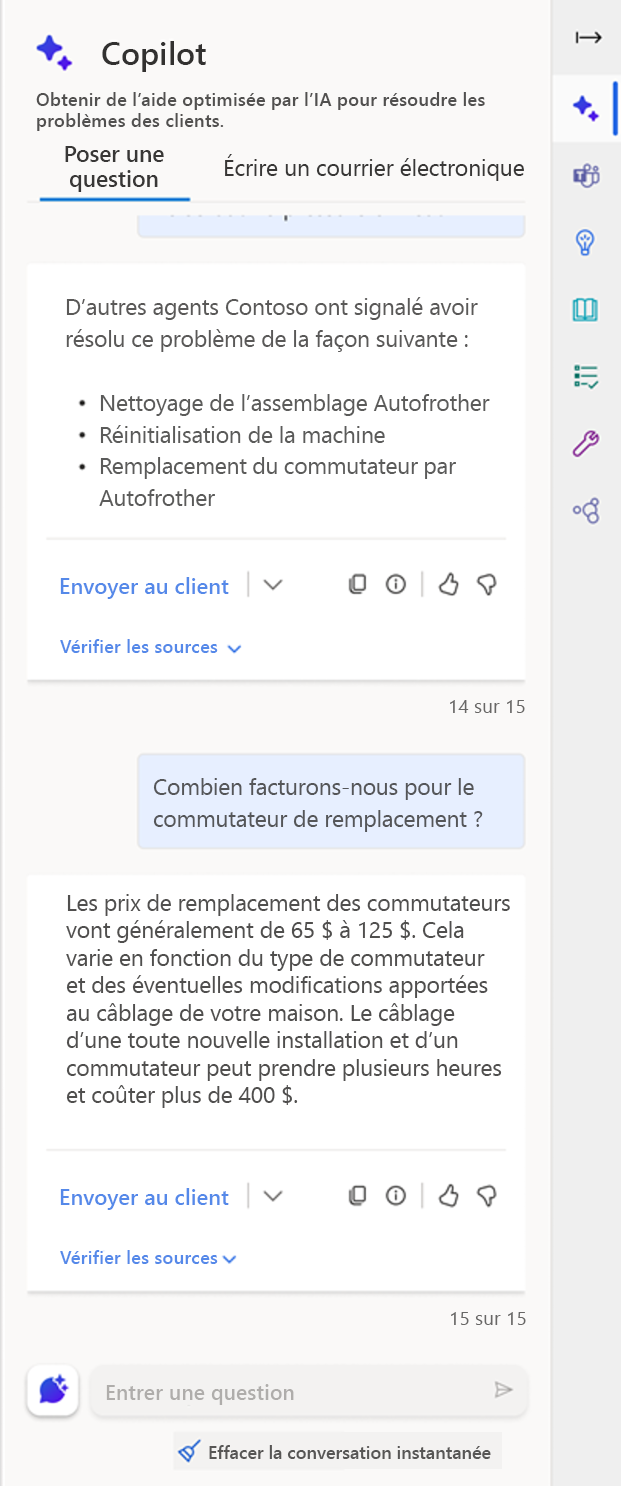 Après avoir reçu une réponse, vous pouvez poser des questions de suivi pour obtenir plus de contexte si nécessaire. Par exemple, dans l’image ci-dessous, le conseiller a d’abord demandé comment résoudre un problème spécifique. Sur la base de la réponse fournie par Copilot, il a pu obtenir des informations plus détaillées telles que le prix d’un commutateur de remplacement.