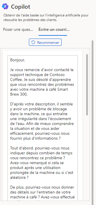 Si vous êtes satisfait de la réponse fournie par Copilot, vous pouvez répondre à la question du client à l’aide de tout ou partie de celle-ci. Plusieurs façons permettent de fournir ces informations à un client, notamment les suivantes :
