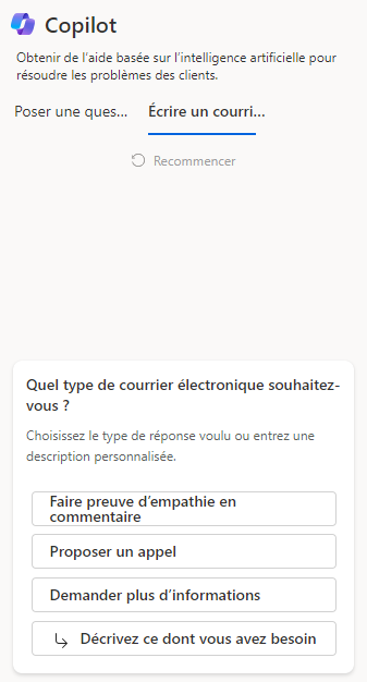 Dans la section Rédiger un e-mail, vous recevez quelques suggestions pour différents types d’e-mails, comme Demander plus d’informations, Fournir des détails sur le produit/service ou Résoudre le problème du client. Si aucune des suggestions ne correspond à ce que vous souhaitez écrire, vous pouvez cliquer sur Décrire ce que vous souhaitez.