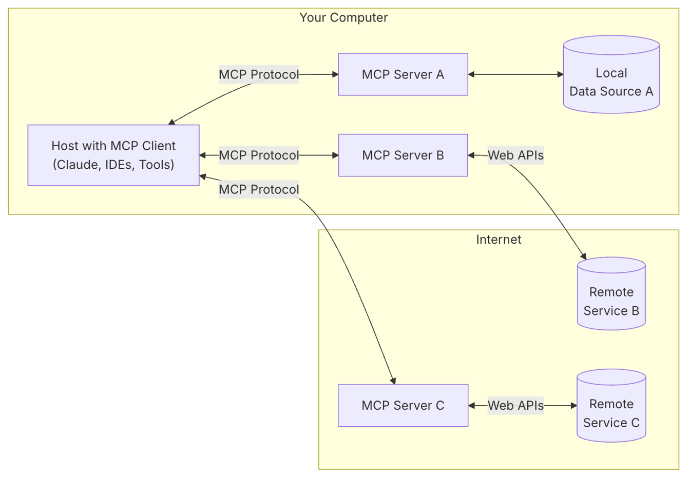 Dans ce scénario, le client MCP communique directement avec un serveur MCP s’exécutant sur votre ordinateur à l’aide du protocole MCP. Ce serveur se connecte ensuite à une source de données locale (par exemple, des fichiers, des bases de données ou d’autres ressources stockées sur votre ordinateur).