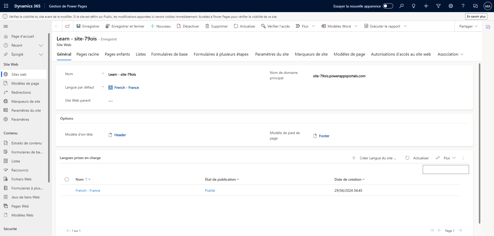 Centre d’administration Power Pages