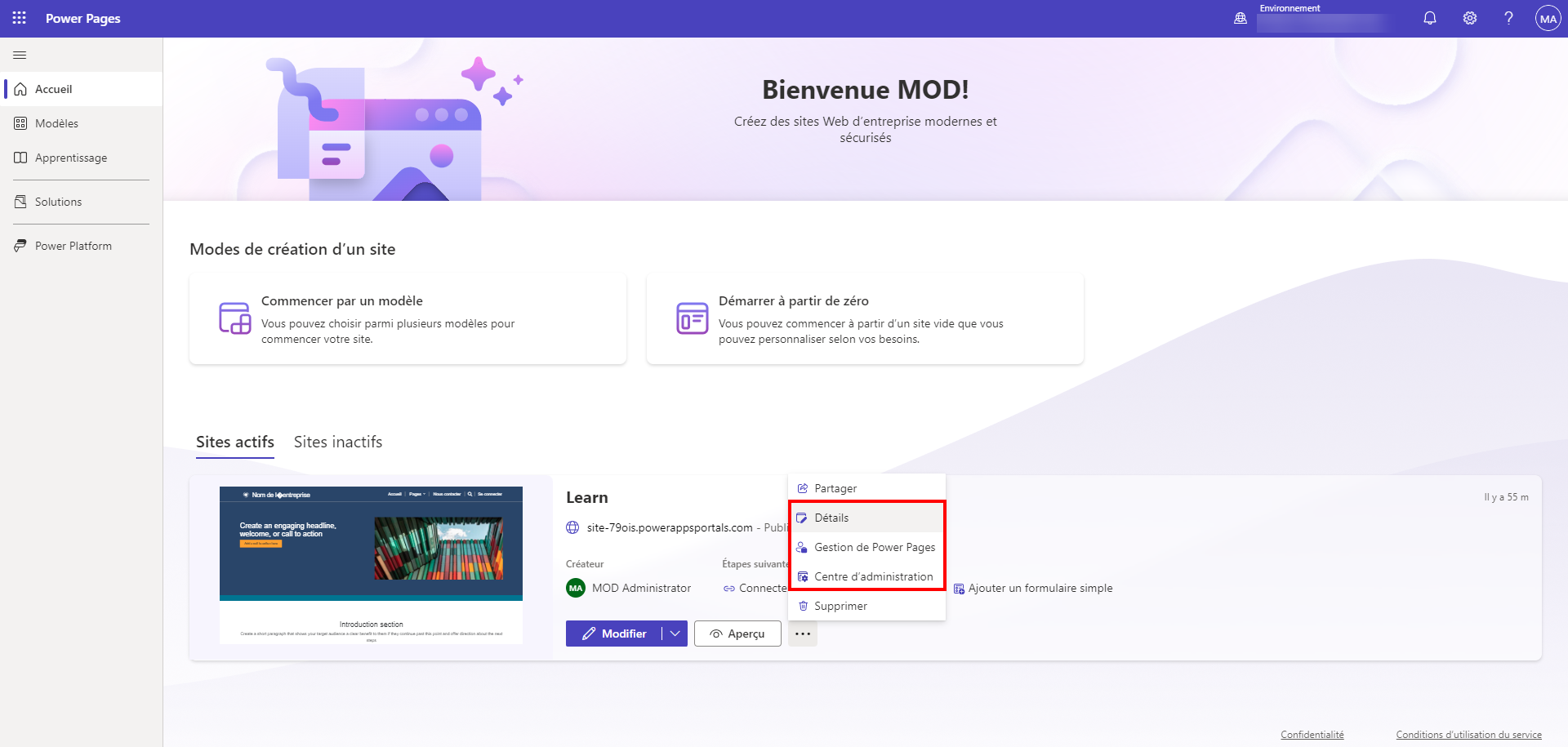 Pour en savoir plus, consultez Présentation de l’application Power Pages Management.