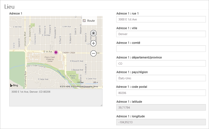 Géolocalisation : vous pouvez configurer un formulaire pour afficher un contrôle de carte, soit pour afficher un emplacement existant sous la forme d’une épingle sur une carte, soit pour permettre à un utilisateur de spécifier un emplacement. Le contrôle de carte du formulaire nécessite d’autres configurations pour déterminer quels sont les différentes colonnes d’emplacement, leur attribuer des valeurs ou en extraire des valeurs. Pour plus d’informations, consultez Configuration de géolocalisation pour les formulaires.