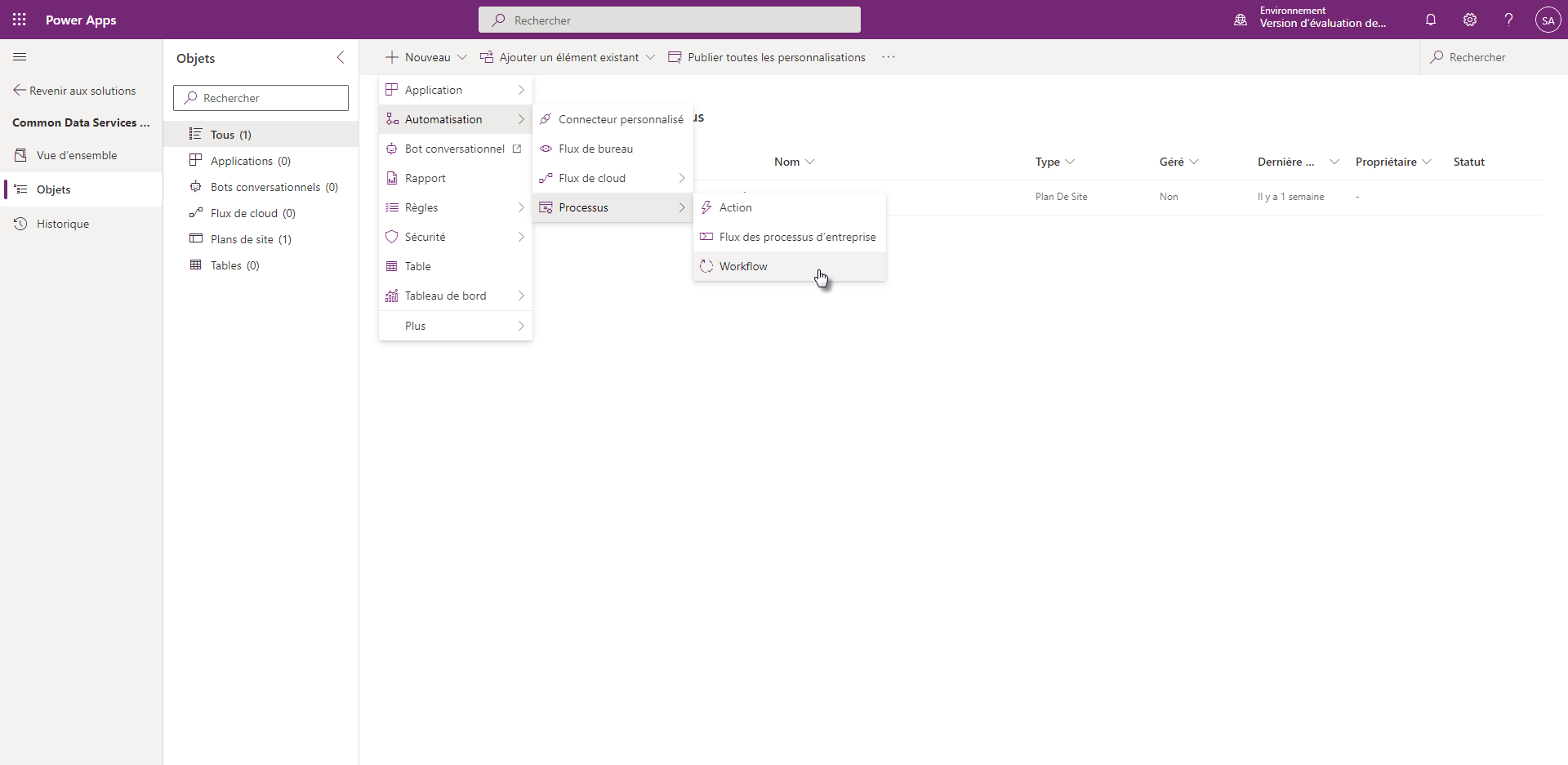 Cliquez sur Nouveau > Automatisation > Processus > Flux de travail.