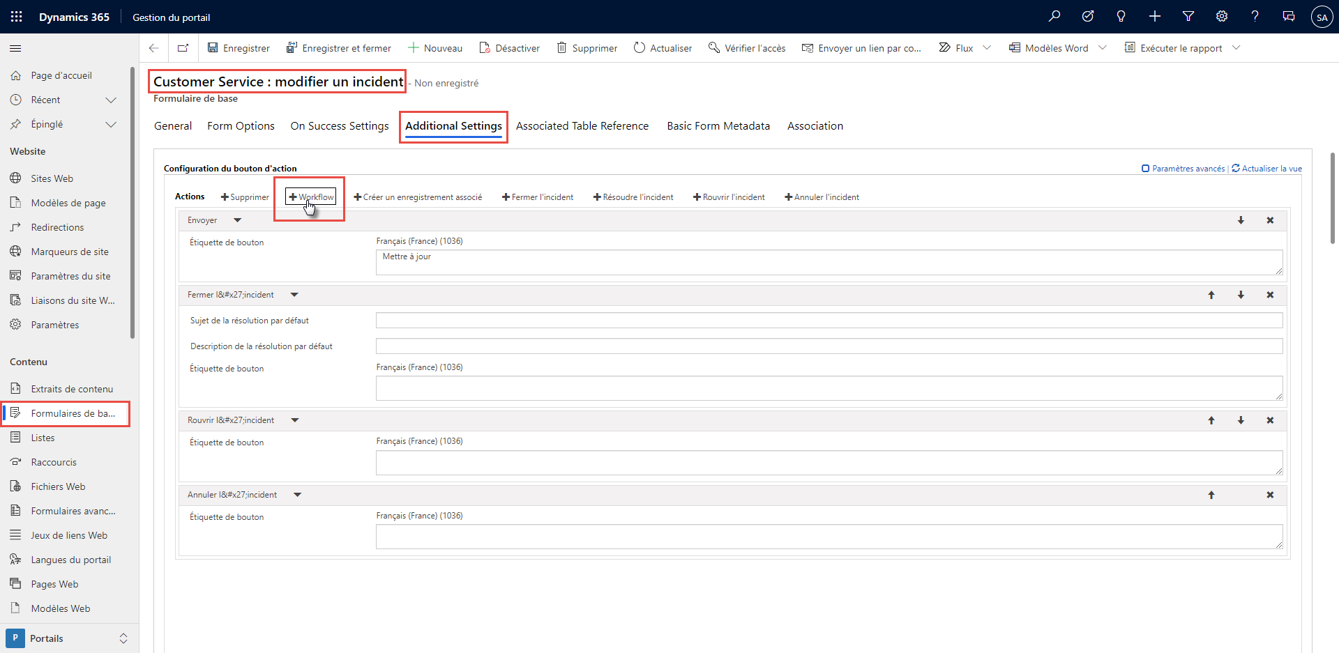 configurer une nouvelle action de flux de travail pour les formulaires de base ;