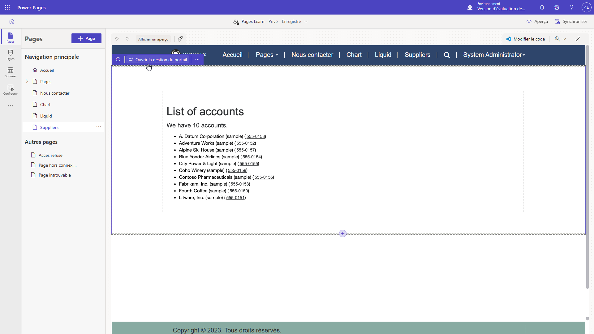 Dans cet exercice, vous allez afficher les enregistrements Dataverse sélectionnés en ajoutant du code HTML et Liquid à la section de texte d’une page web à l’aide de l’éditeur de code du studio de conception Power Pages.