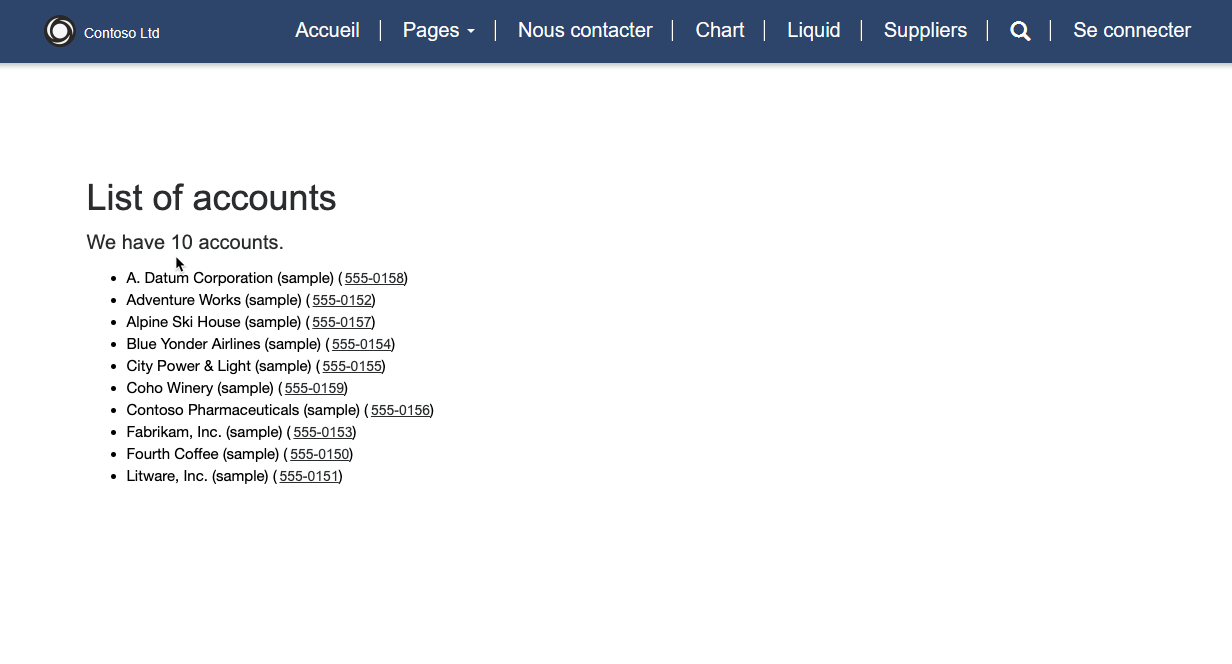 <h2>List of accounts</h2> {% entityview logical_name:'account', name:'Active Accounts' %} <p>We have {{ entityview.total_records }} accounts.</p> <ul> {% for account in entityview.records -%} <li>{{ account.name }} {% if account.telephone1 %} (<a href="tel:{{ account.telephone1 }}">{{ account.telephone1 }}</a>) {% endif %} </li> {% endfor %} </ul> {% endentityview %}Cliquez sur Synchroniser.