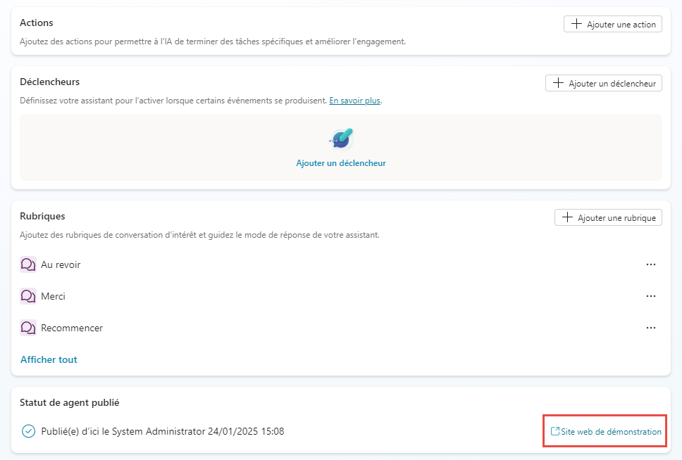 Avant de déployer l’agent sur les différents canaux qui l’utilisent, vous pouvez recueillir des commentaires auprès des autres membres de l’équipe. Lorsqu’un agent est publié pour la première fois, il peut être mis à disposition sur le site web de démonstration. Vous pouvez fournir l’URL du site web de démonstration aux membres de l’équipe ou aux parties prenantes pour le tester. L’avantage du recours au site web de démonstration est que l’expérience est différente de celle du test de l’agent au cours du processus de conception. L’expérience de l’agent de test n’est destinée qu’à permettre aux auteurs d’agents de le tester. Ainsi, le lien du site web de démonstration augmente le nombre d’utilisateurs pouvant tester l’agent et commenter l’expérience globale qu’il offre.