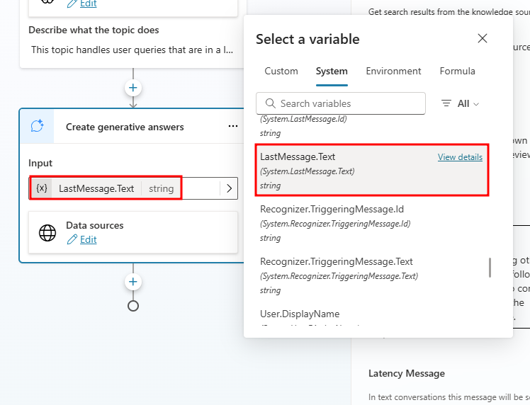 Choisissez LastMessage.Text sous l’onglet Système dans le menu Sélectionner une variable.