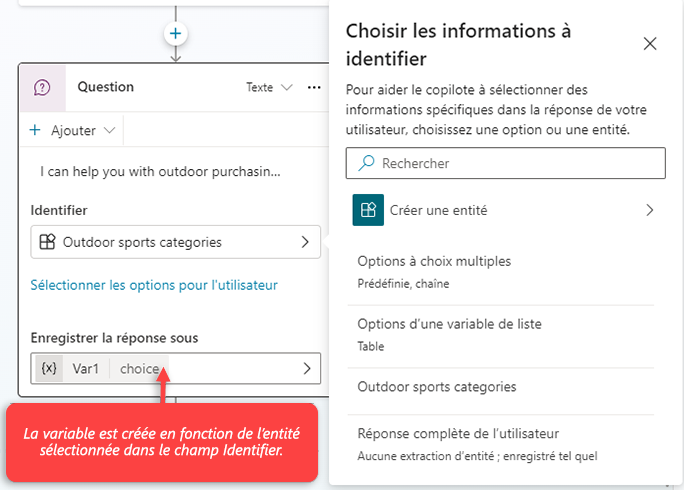 Les variables sont créées automatiquement lorsque vous ajoutez un nœud Question à une rubrique et peuvent être modifiées dans la section Enregistrer la réponse de l’utilisateur sous forme de. Par défaut, lorsqu’un nœud Question est inséré, il est créé à l’aide d’options à choix multiple. Cependant, il est possible d’utiliser toute entité prédéfinie ou personnalisée en la sélectionnant sous Identifier.