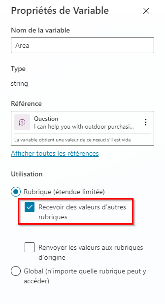 Lorsque vous définissez une variable dans une rubrique (par exemple en insérant un nœud de question), la réponse de l’utilisateur aux questions est renseignée dans la variable associée à la question concernée. Comme vous disposez déjà de la valeur, il n’y a aucune raison de reposer la question. Dans ces cas, vous pouvez cocher la case Recevoir des valeurs d’autres rubriques pour la variable.