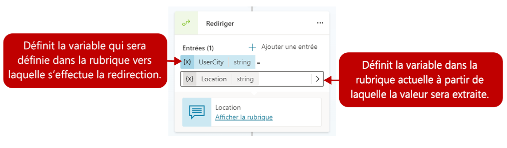 Lors de la configuration de votre nœud de redirection, vous devez définir la variable que vous souhaitez renseigner dans la rubrique de destination. Après avoir spécifié la variable que vous souhaitez définir dans la rubrique de destination, indiquez la valeur utilisée dans la rubrique actuelle. Par exemple, dans l’image ci-dessous, nous redirigeons vers une rubrique nommée Location. La variable UserCity de la rubrique Location est définie sur une variable textuelle nommée Location de la rubrique de redirection.