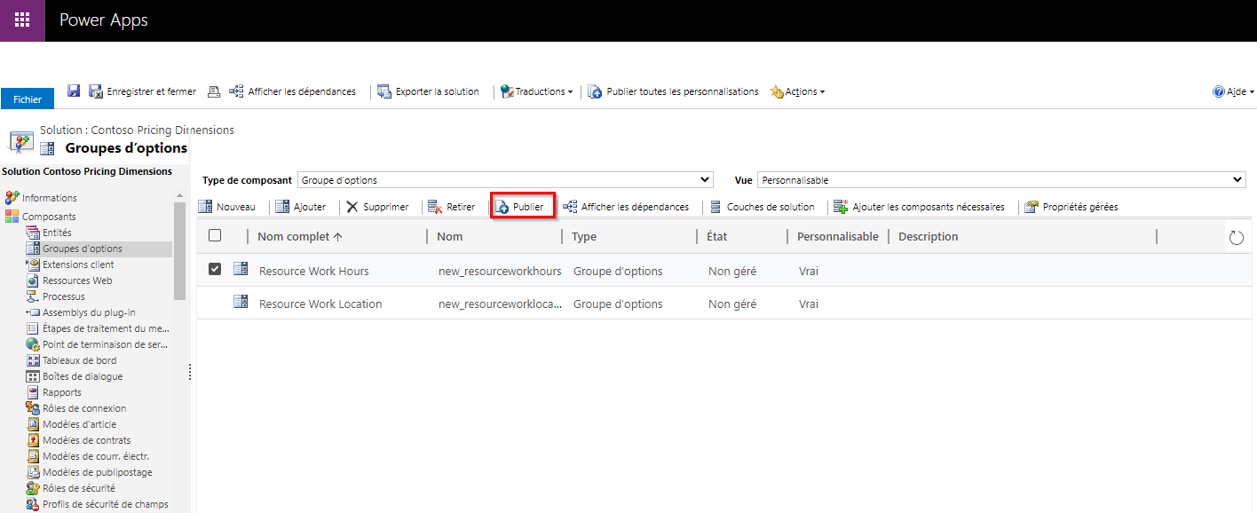 Pour ajouter des champs aux entités en fonction des groupes d’options que vous créez, vous devez veiller à les Publier avant qu’ils ne s’affichent dans le menu déroulant Groupes d’options existant. Pour ce faire, sélectionnez les groupes d’options que vous souhaitez publier, puis cliquez sur le bouton Publier.