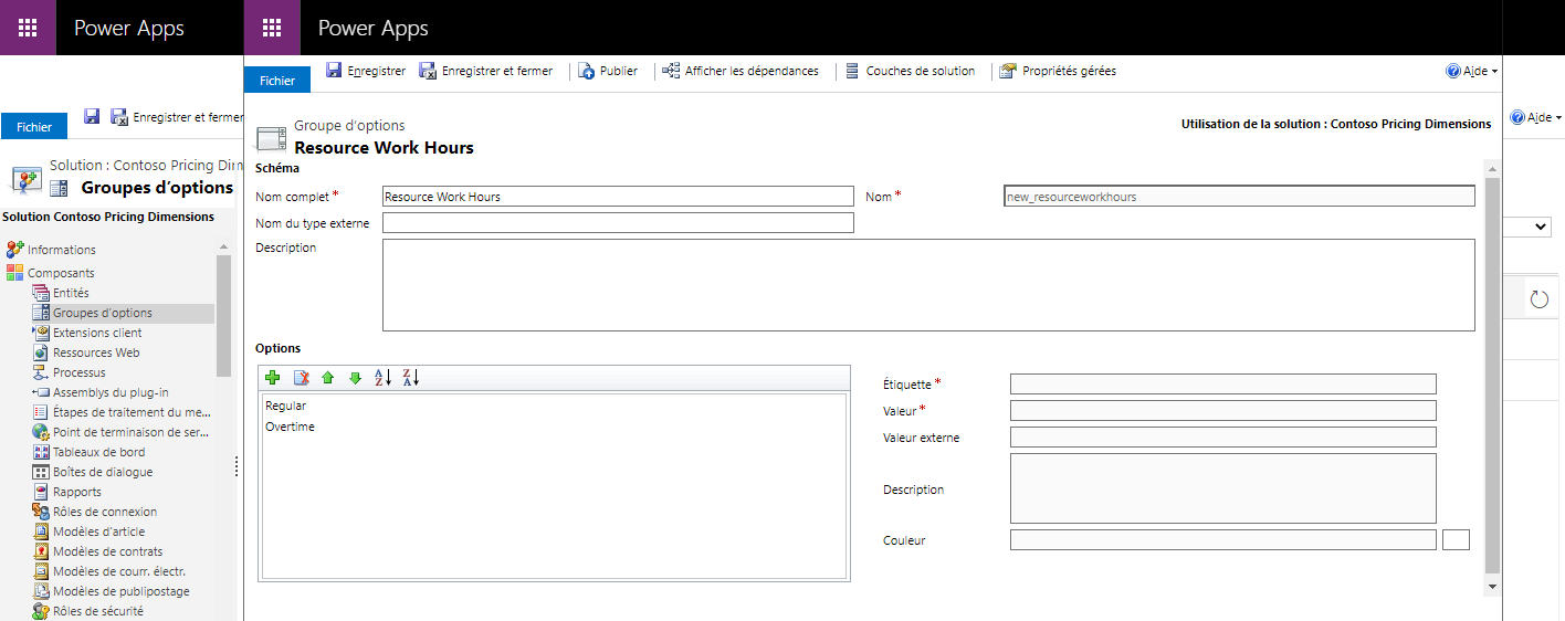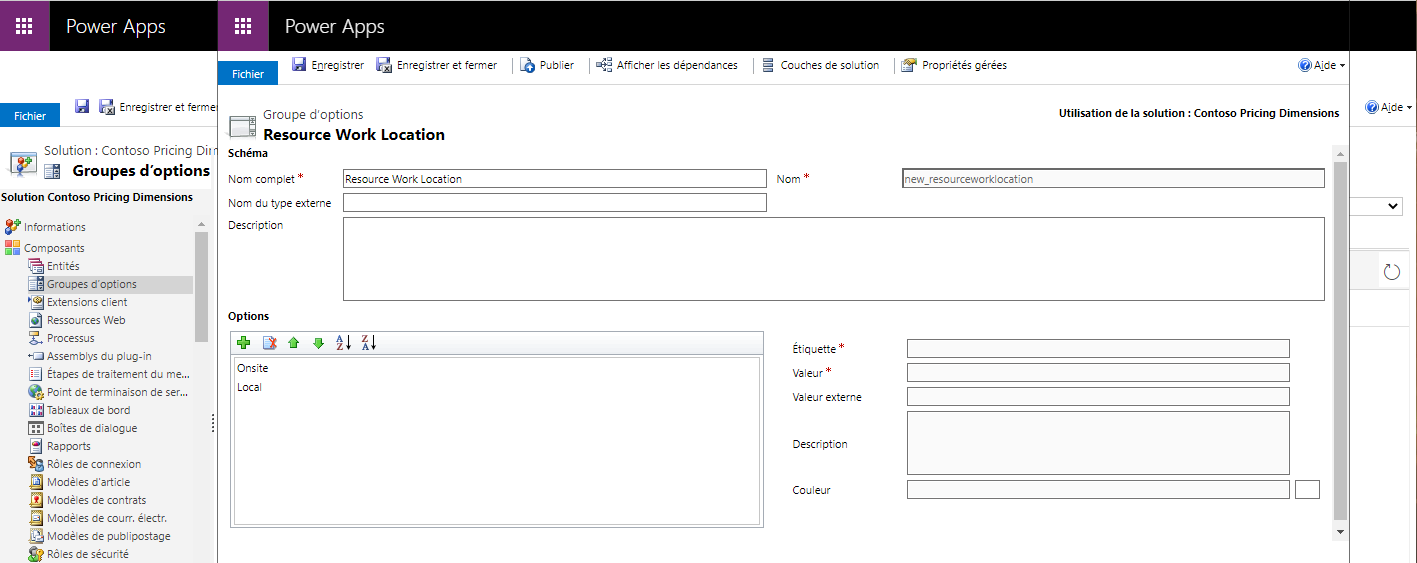 Voici les deux types de dimensions basées sur un groupe d’options que vous pouvez créer : Emplacement de travail de la ressource et Heures de travail de la ressource.