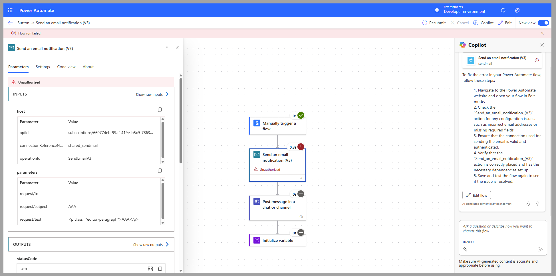 Sélectionnez l’action pour consulter les détails de l’erreur, qui sont visibles dans le volet gauche. Copilot dans Microsoft Power Automate fournit également des informations sur l’erreur ainsi que des suggestions sur la façon de la corriger.