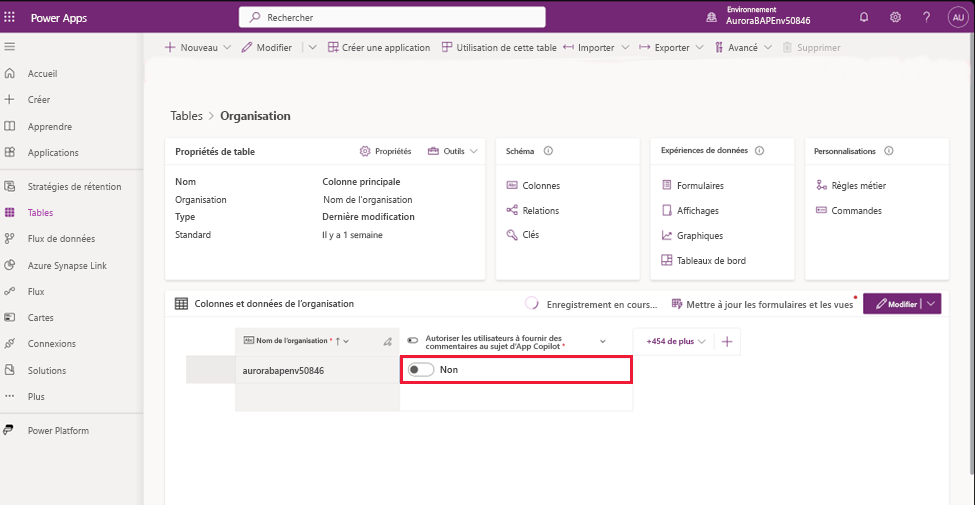 Les administrateurs peuvent désactiver cette fonctionnalité. La table Organisation comporte la colonne Autoriser les utilisateurs à fournir des commentaires pour Copilot pour les applications, qui peut être définie sur Non.