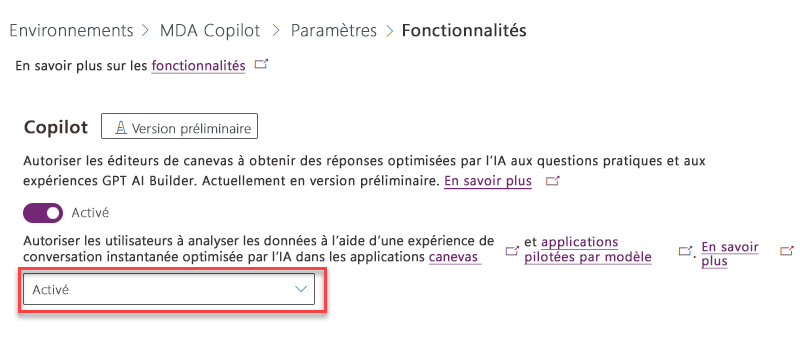 Pour activer Copilot pour les utilisateurs d’applications pilotées par modèle, procédez comme suit :