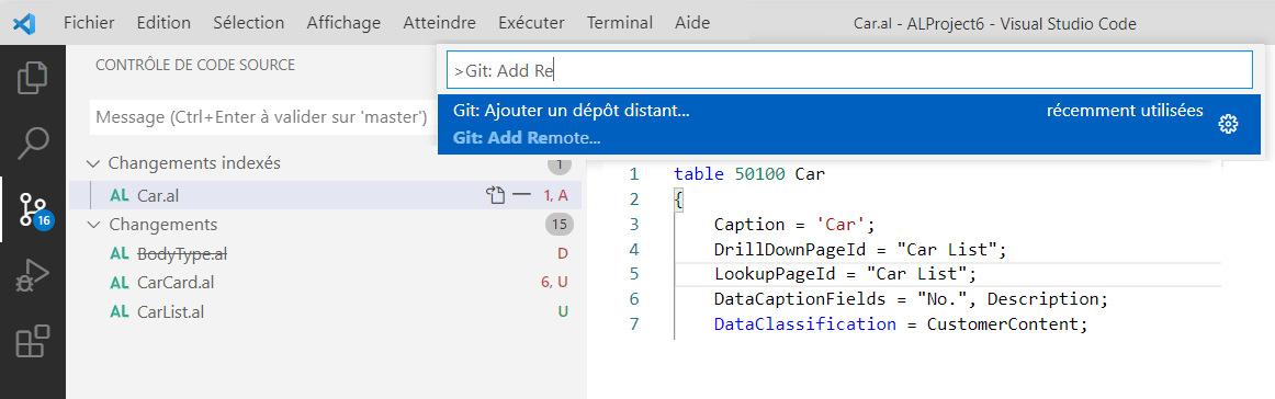 Dans Visual Studio Code, une option permet également de lier le référentiel distant. Utilisez Vue, Palette de commandes (Ctrl + Maj + P) et recherchez Git: Add Remote.