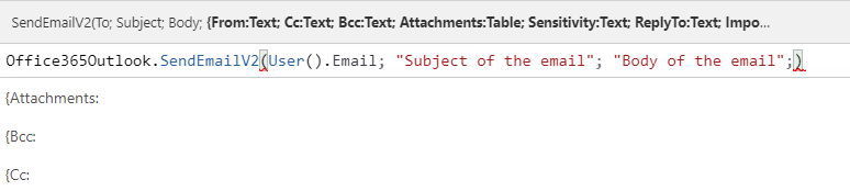 Cette formule exécute l’action que vous avez définie dans la formule OnSelect pour votre bouton pour SendEmailV2 depuis le connecteur de données Office365Outlook. L’action SendEmailV2 ne requiert que trois entrées :