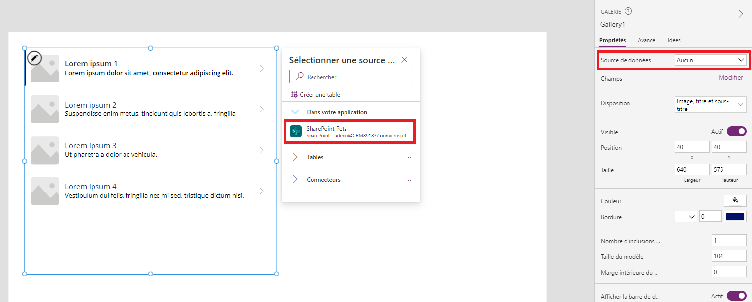 Dans le volet de dialogue Sélectionner une source de données pour le contrôle Galerie verticale que vous avez inséré, vous pouvez saisir le nom de la table dans la fenêtre de recherche ou sélectionner votre table dans le menu déroulant pour Dans votre application. Vous pouvez également cliquer sur le menu déroulant Source de données dans le volet Propriétés de votre galerie.