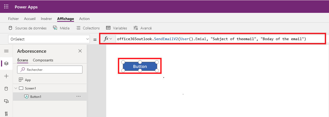 Pour envoyer un e-mail à l’aide de Office 365 Outlook, vous pouvez ajouter un contrôle Bouton à votre application et définir sa propriété OnSelect comme suit :