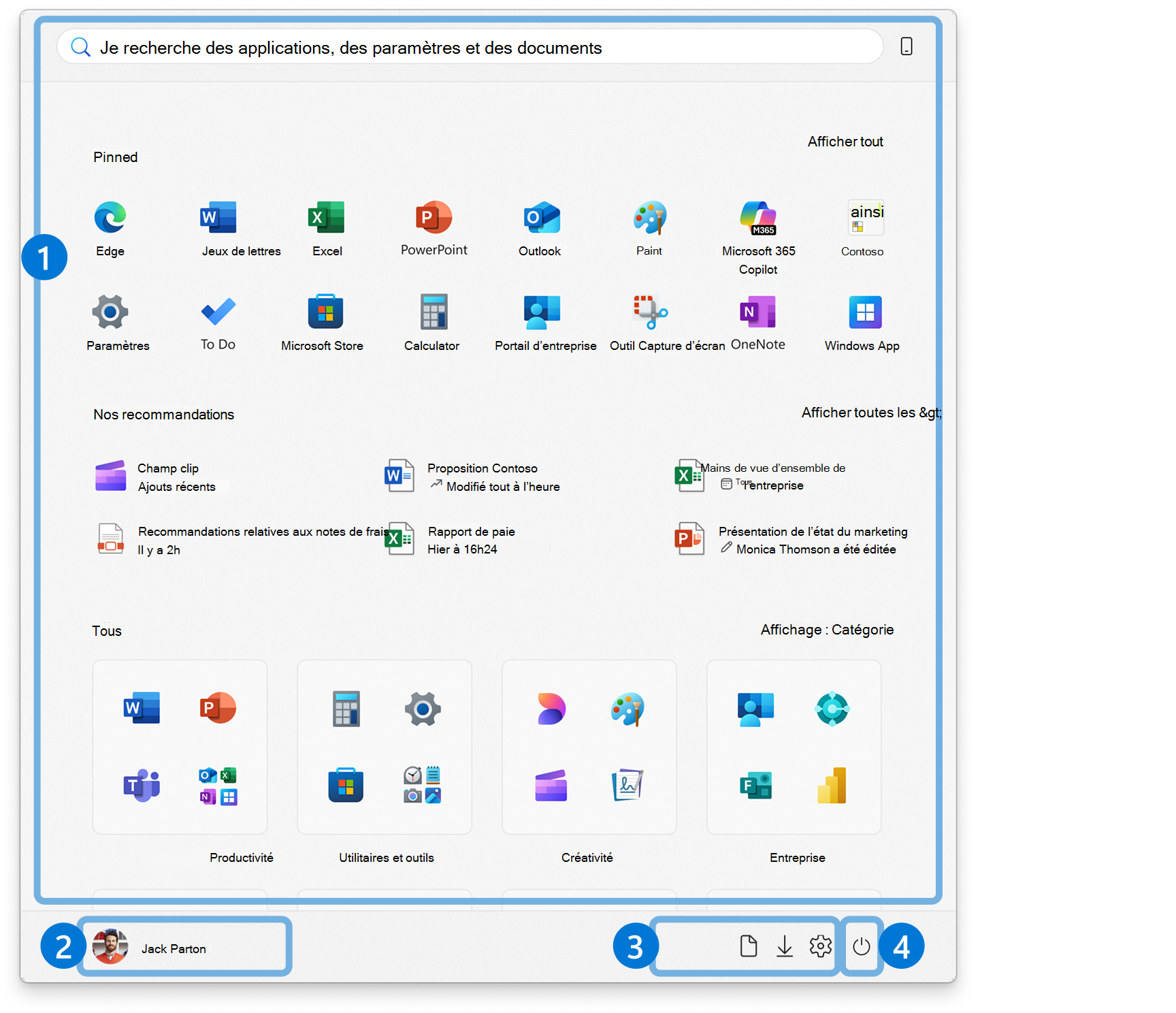 - Disposition de l’écran de démarrage : paramètres permettant de contrôler l’apparence du menu Démarrer et son comportement pour les sections Épinglées, Recommandées et Toutes