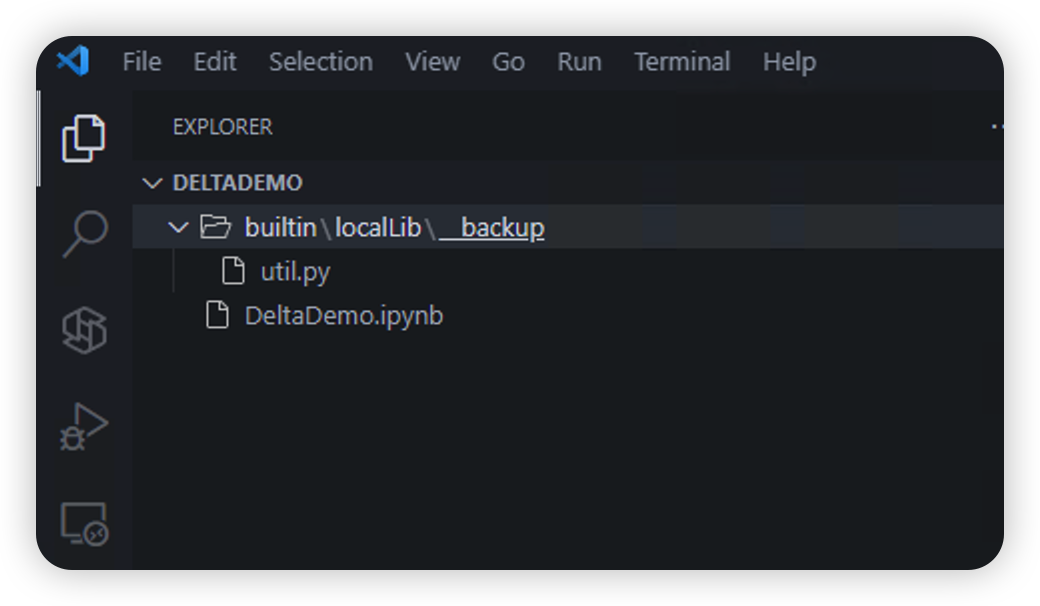 The following screenshot shows the util.py file moved to the _backup subfolder under the localLib folder because someone deleted it in the remote workspace.