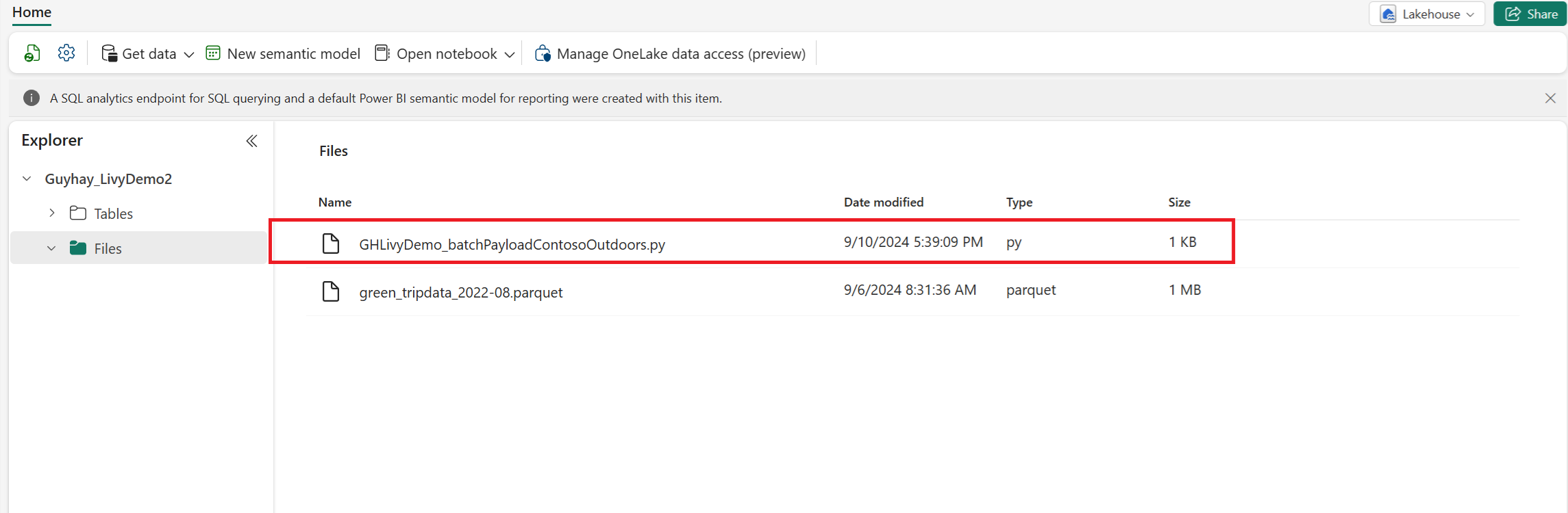 Upload the Python payload to the files section of your Lakehouse. In the Lakehouse explorer, select Files. Then select > Get data > Upload files. Select files via the file picker.