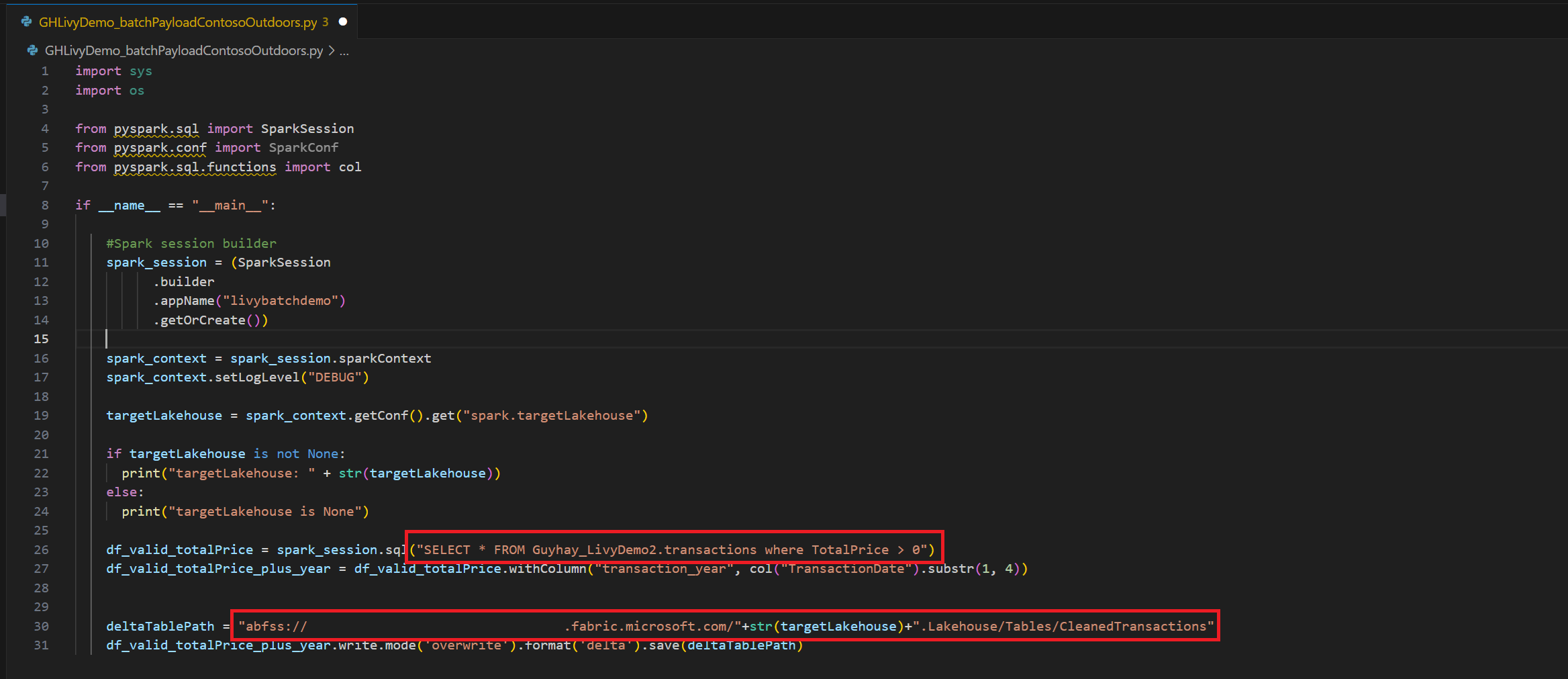 .ipynbnotebook in Visual Studio Code and insert the following codeimport sys import os from pyspark.sql import SparkSession from pyspark.conf import SparkConf from pyspark.sql.functions import col if __name__ == "__main__": #Spark session builder spark_session = (SparkSession .builder .appName("batch_demo") .getOrCreate()) spark_context = spark_session.sparkContext spark_context.setLogLevel("DEBUG") tableName = spark_context.getConf().get("spark.targetTable") if tableName is not None: print("tableName: " + str(tableName)) else: print("tableName is None") df_valid_totalPrice = spark_session.sql("SELECT * FROM green_tripdata_2022 where total_amount > 0") df_valid_totalPrice_plus_year = df_valid_totalPrice.withColumn("transaction_year", col("lpep_pickup_datetime").substr(1, 4)) deltaTablePath = f"Tables/{tableName}CleanedTransactions" df_valid_totalPrice_plus_year.write.mode('overwrite').format('delta').save(deltaTablePath)Save the Python file locally. This Python code payload contains two Spark statements that work on data in a Lakehouse and needs to be uploaded to your Lakehouse. You need the ABFS path of the payload to reference in your Livy API batch job in Visual Studio Code and your Lakehouse table name in the Select SQL statement.