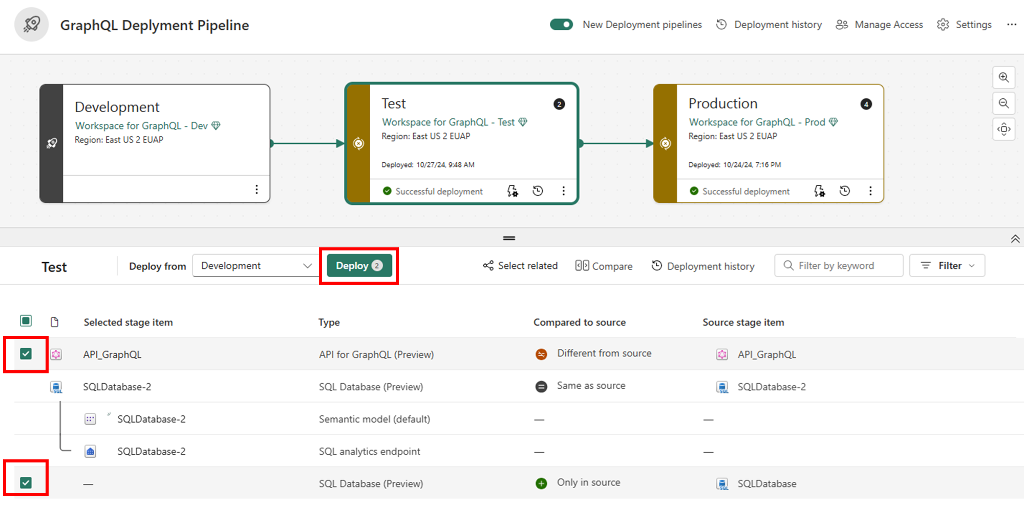 Select the APIs for GraphQL and any related items (such as connected data sources) that you want to deploy. Then select Deploy to move them to the next stage.