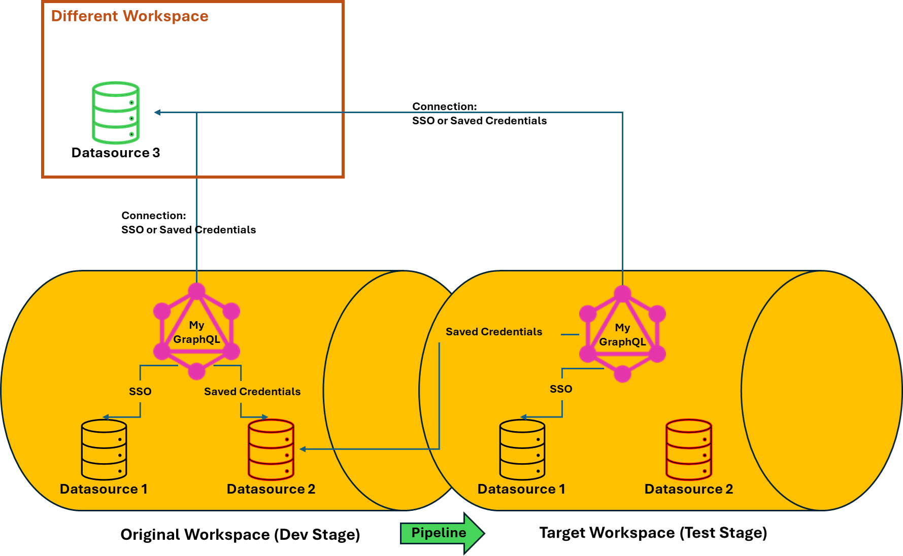 Autobinding behavior in deployment pipelines: When you deploy an API using saved credentials from the source workspace (Dev) to the target workspace (Test):