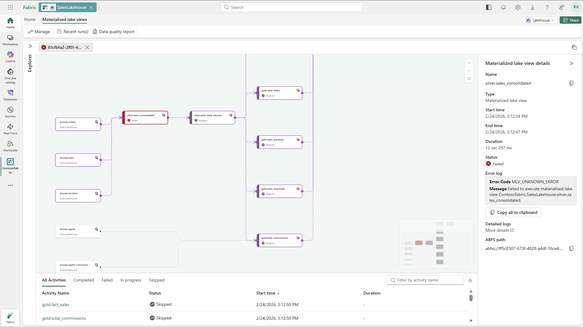 Select a materialized lake view node in lineage to see execution details, its ABFS path, and a link to detailed logs.