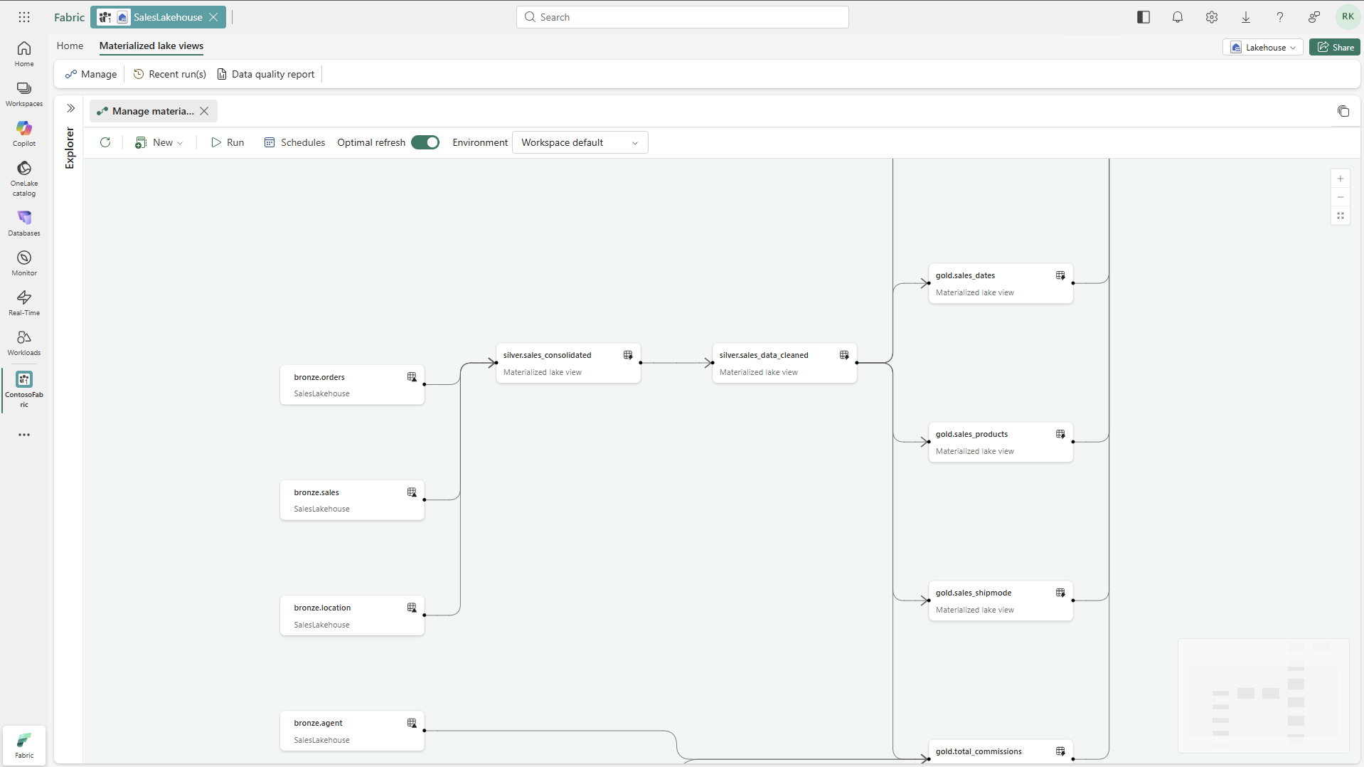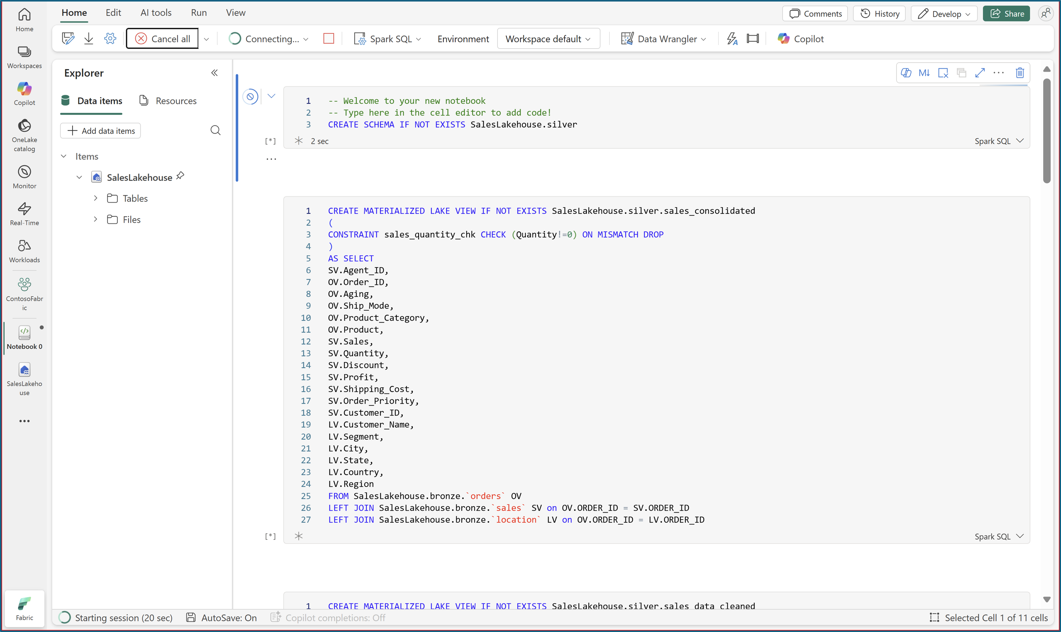 In this section, you create the bronze, silver, and gold layers for the medallion architecture in SalesLakehouse. These layers define the lineage-based data flow for your materialized lake views.