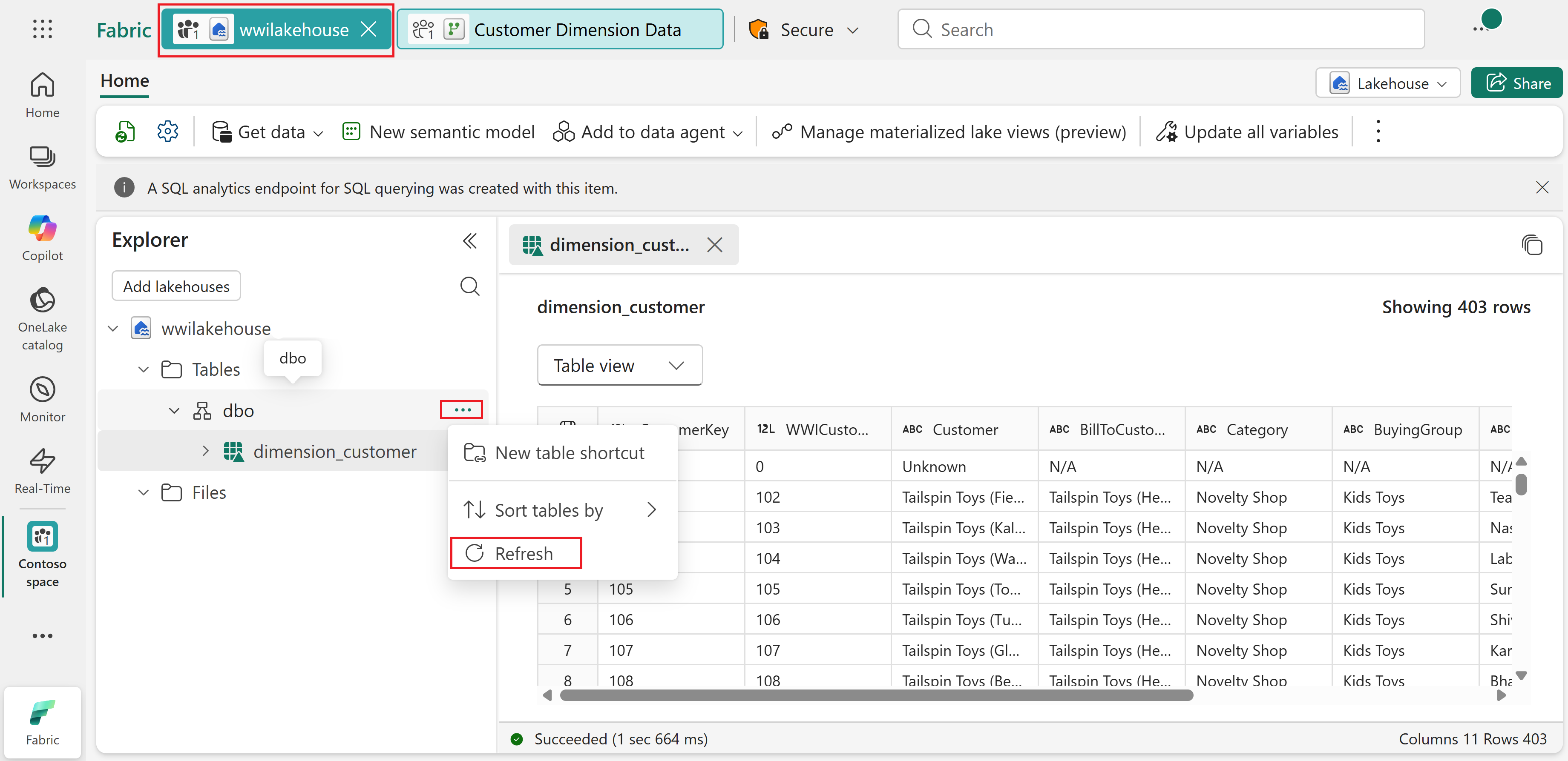 Once the refresh is complete, expand the dbo schema to view the dimension_customer Delta table. Select the table to preview its data.