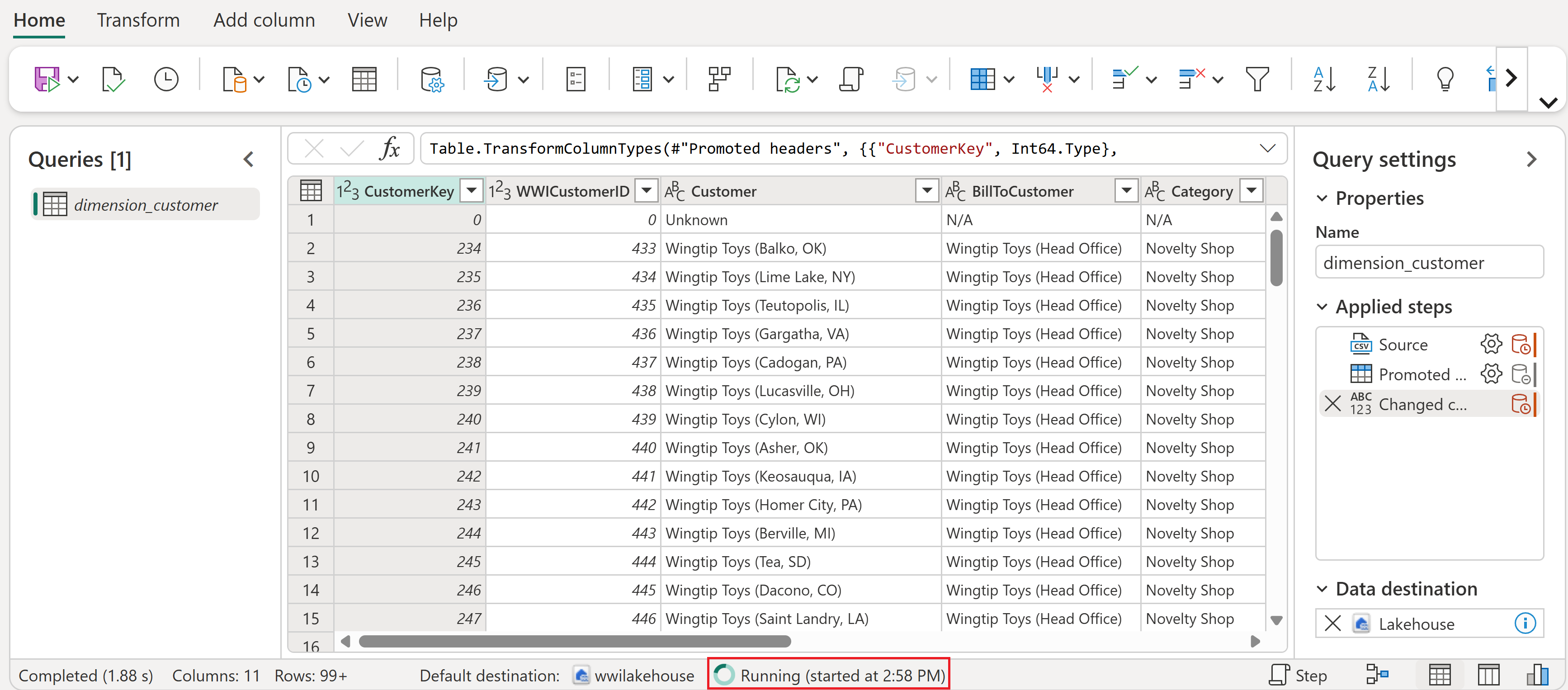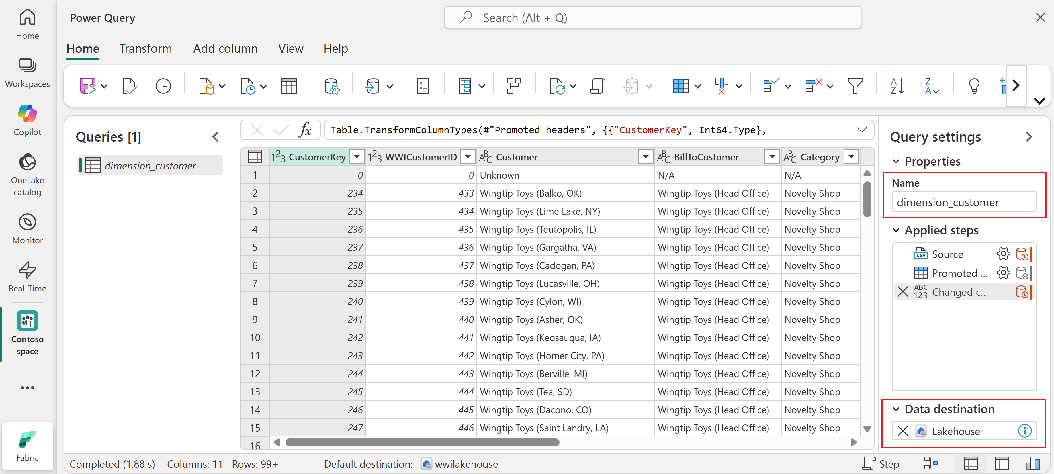 In the Query settings pane, make sure the Name field is set to dimension_customer. This name is used as the table name in the lakehouse, so it must be lowercase and must not contain spaces.