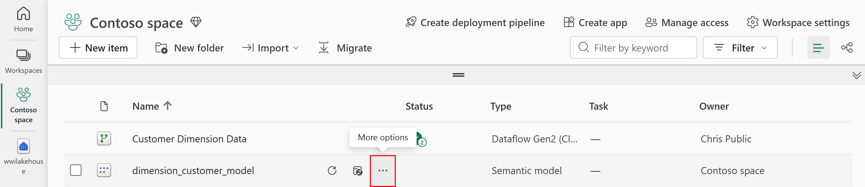 In your workspace, find the semantic model you created, select the ... (ellipsis) menu, and then select Auto-create report.