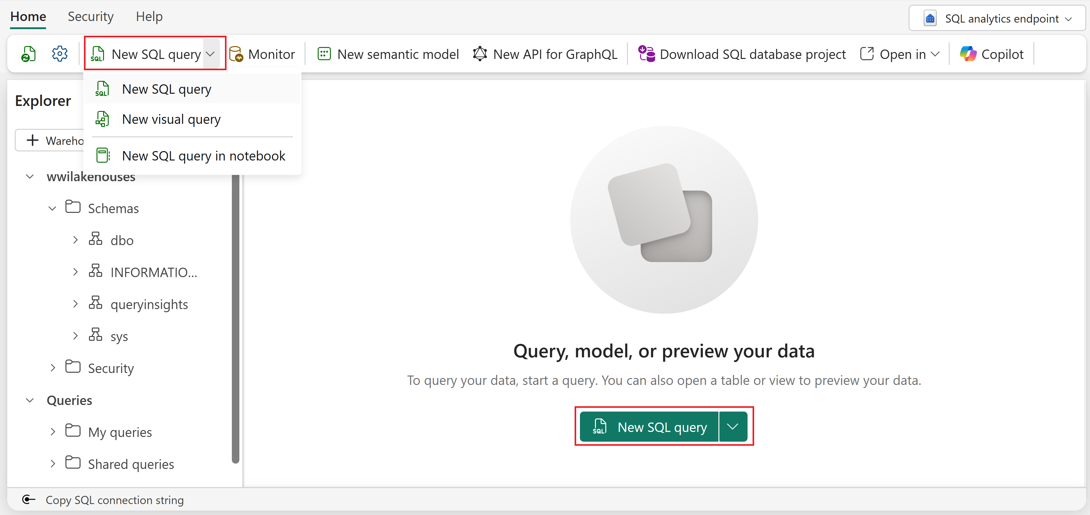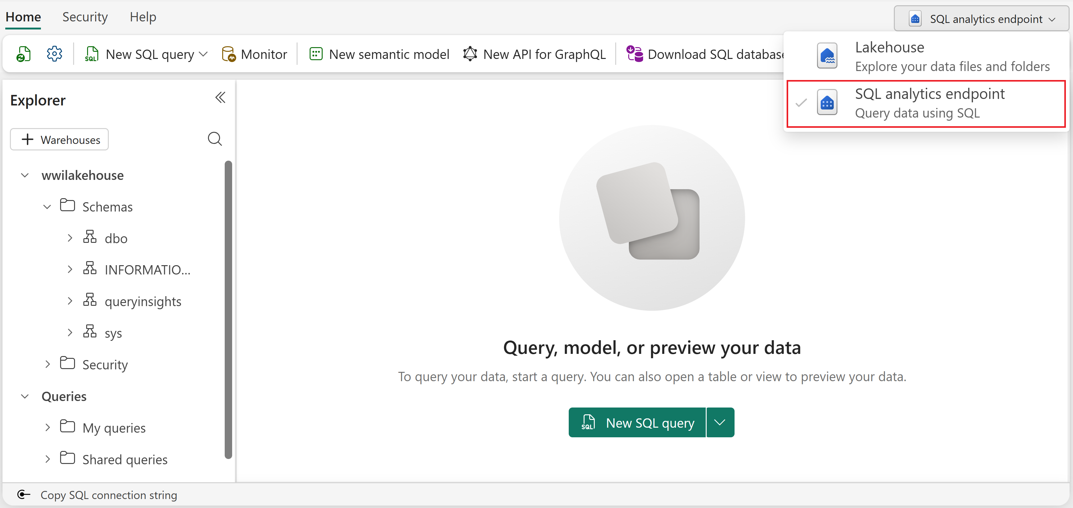 Open your lakehouse and switch to the SQL analytics endpoint view.