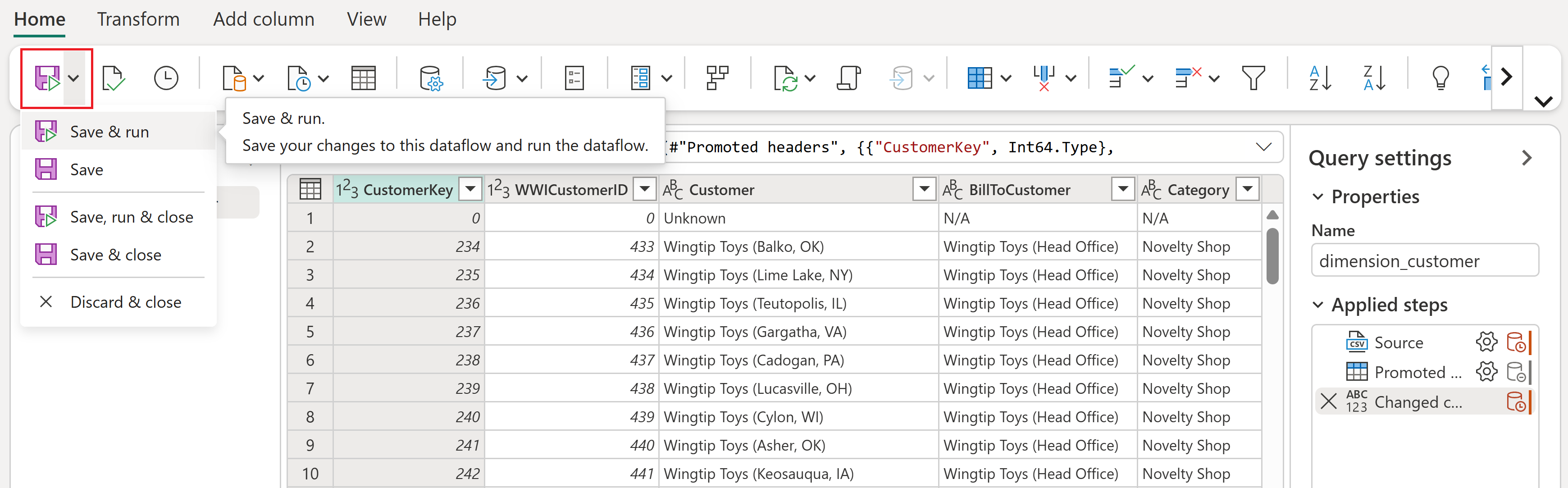 From the dataflow canvas, you can easily transform the data based on your business requirements. For simplicity, we aren't making any changes in this tutorial. To proceed, select Save and Run in the tool bar.