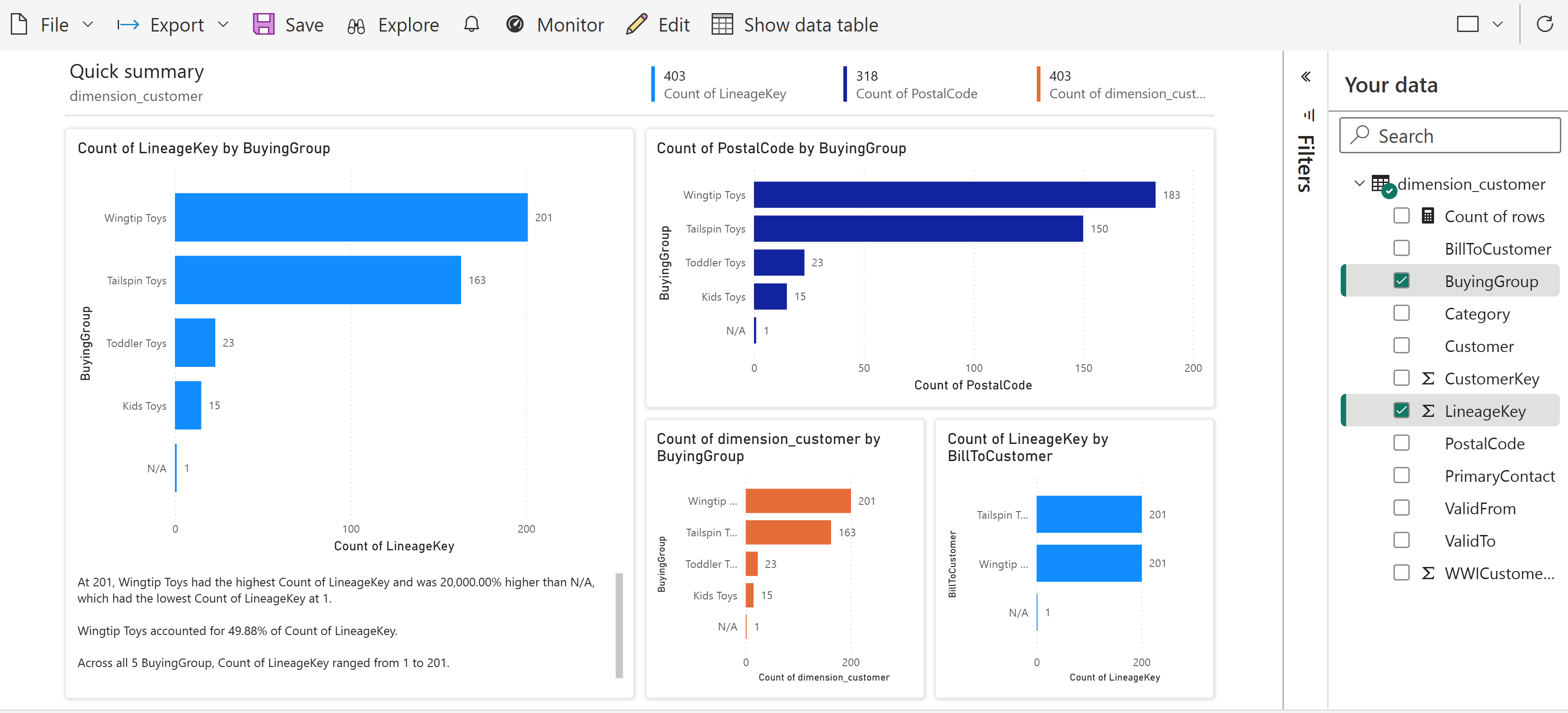 Enter the following sample query that aggregates the row count based on the BuyingGroup column of the dimension_customer table.