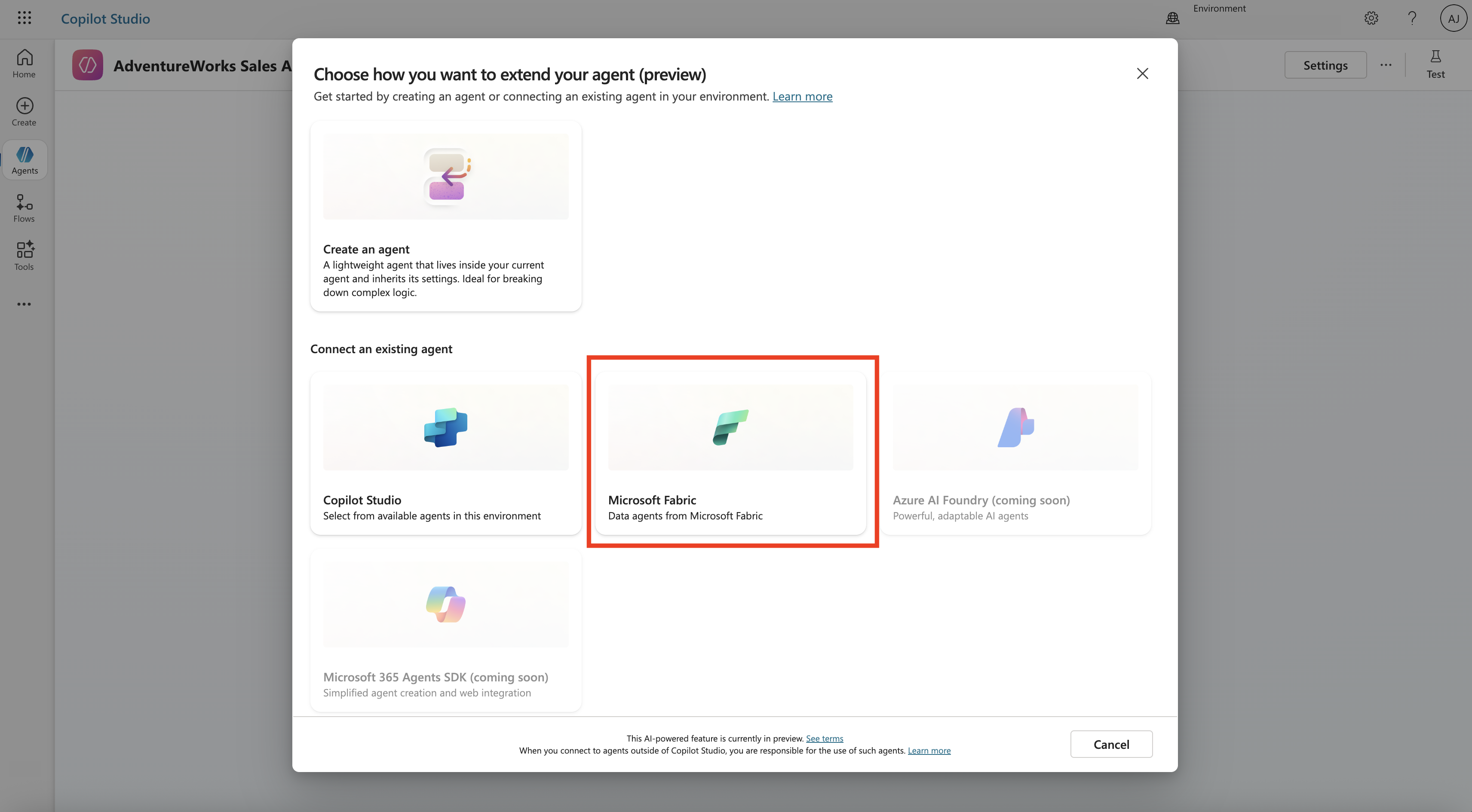 How to add a Fabric data agent to the custom AI agent in Copilot Studio