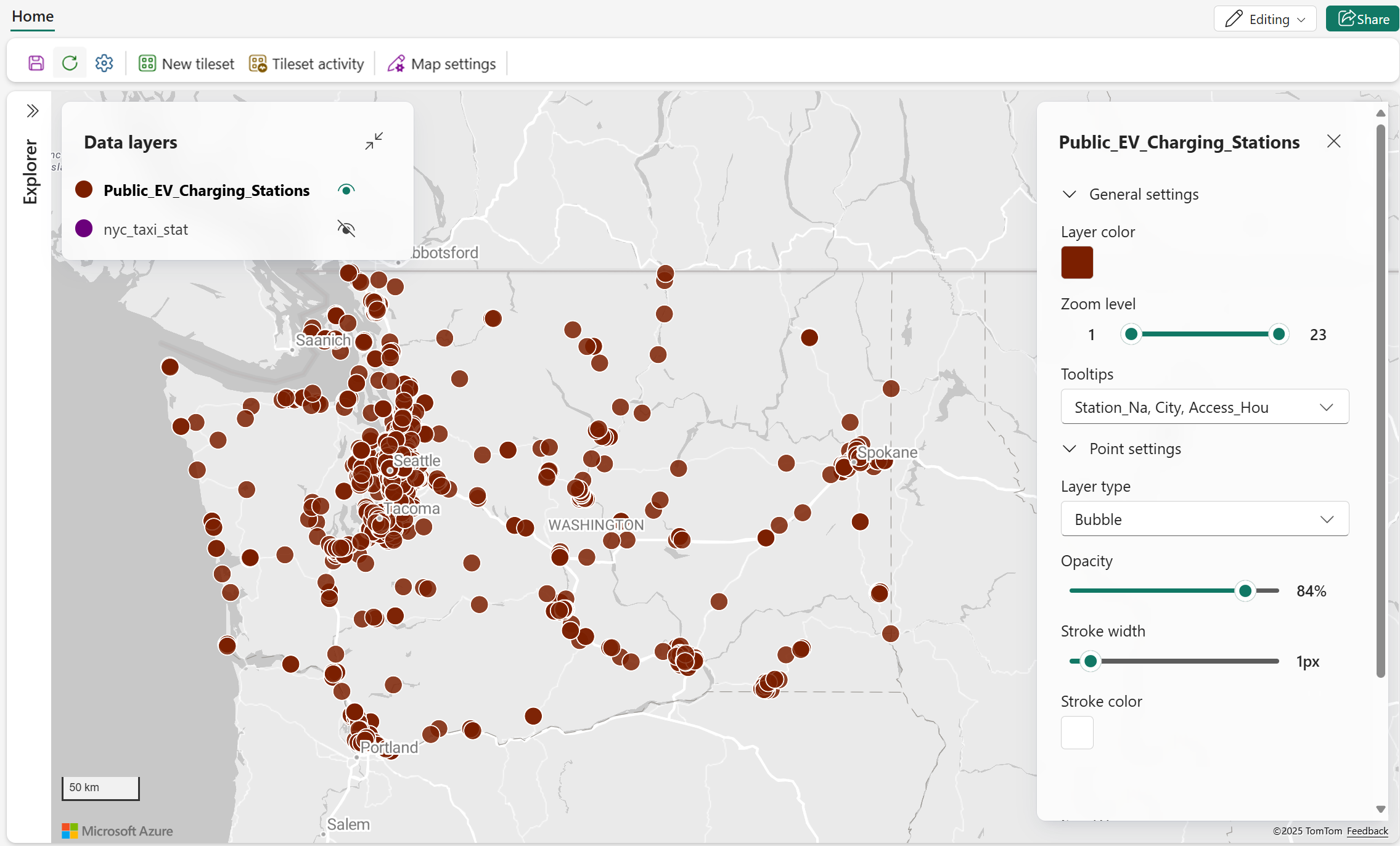 The following screenshot shows EV charging station locations across Washington State. A bubble layer is used to represent the data, which consists of point features. Each station is visualized as a bubble, with size and opacity customized to reflect station-specific attributes.