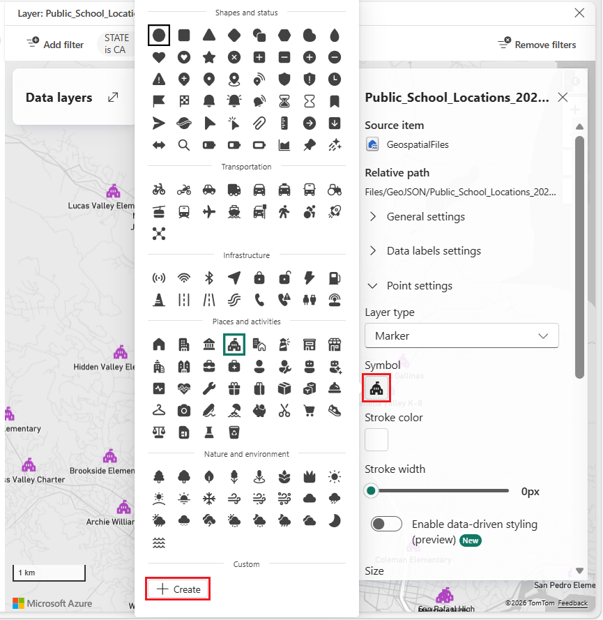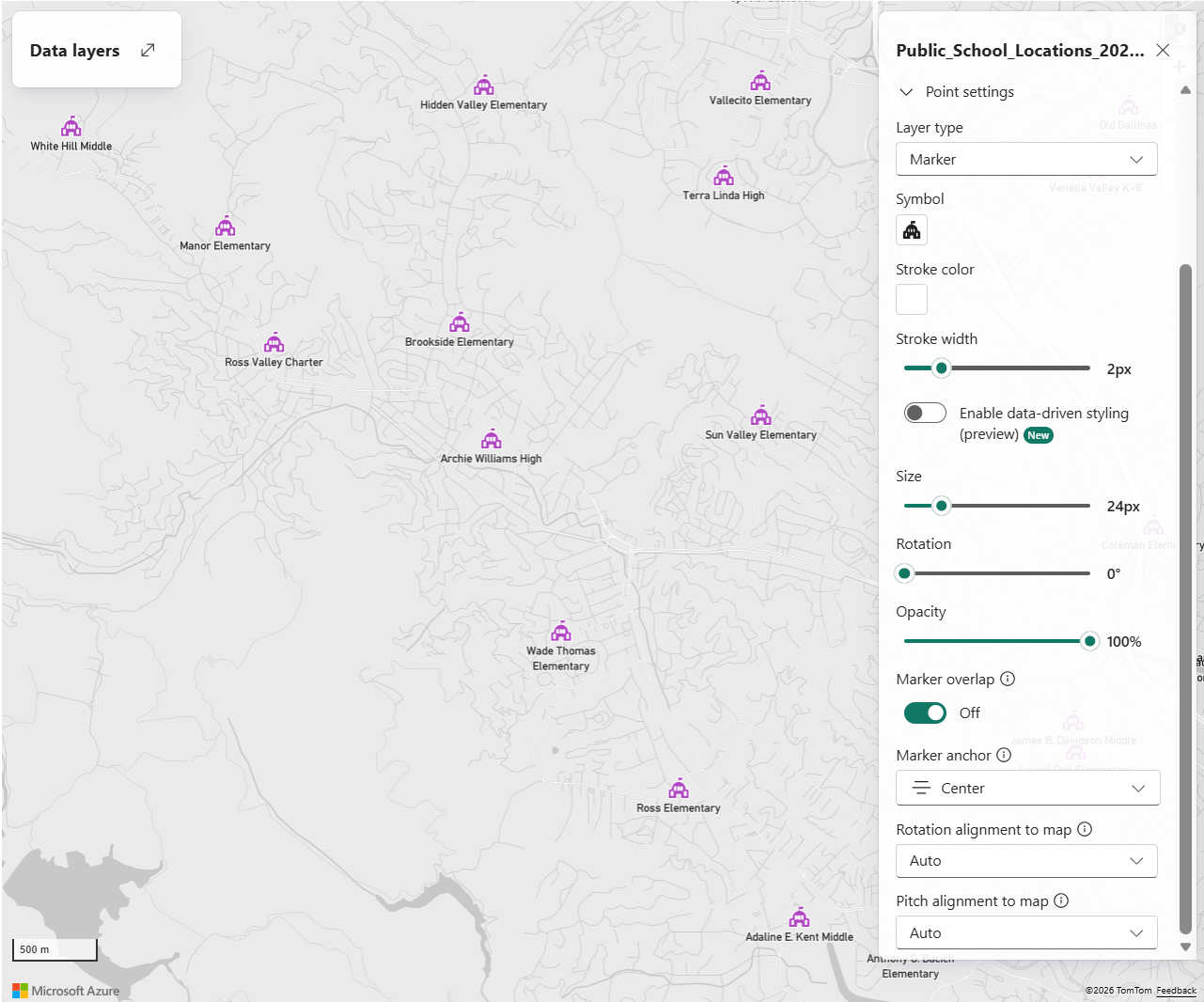 | Data-driven styling | Colors are driven by the selected data field and apply only to predefined markers. Custom markers don't support data-driven color styling. For more information, see Data-driven styling for map layers. |