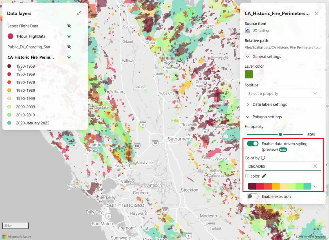 This example uses polygons that represent areas previously affected by forest fires in California, with each polygon labeled using the official fire name: